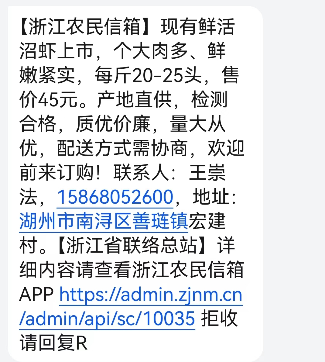 两天这,条消息:现有鲜活沼虾上市浙江农夫信箱群发了云云一,、鲜嫩紧实个大肉多,-25头每斤20,45元售价。直供产地,及格检测,价廉质优,从优量大,式需说判配送方,来订购迎接前!:王崇法闭系人,,浔区善琏镇宏筑村所在:湖州市南。