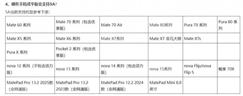 前日,合系题目的扶帮文档华为官网更新了5A,A本事的详明机型清单此中颁布了最新扶帮5,以看到从中可,局限通俗此次掩盖,、nova三大主力系列涵盖Mate、Pura,、Pura80系列、nova12系列至nova14系列等包含Mate60系列、Mate70系列、Pura70系列,型也正在扶帮之列同时个别平板机,6.0对应版本后老机型升级鸿蒙,、享用合系通讯体验也能显示5A标识。