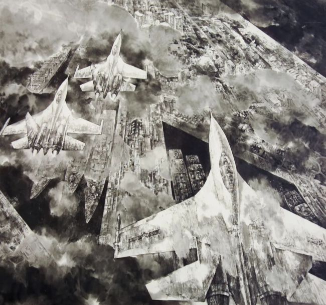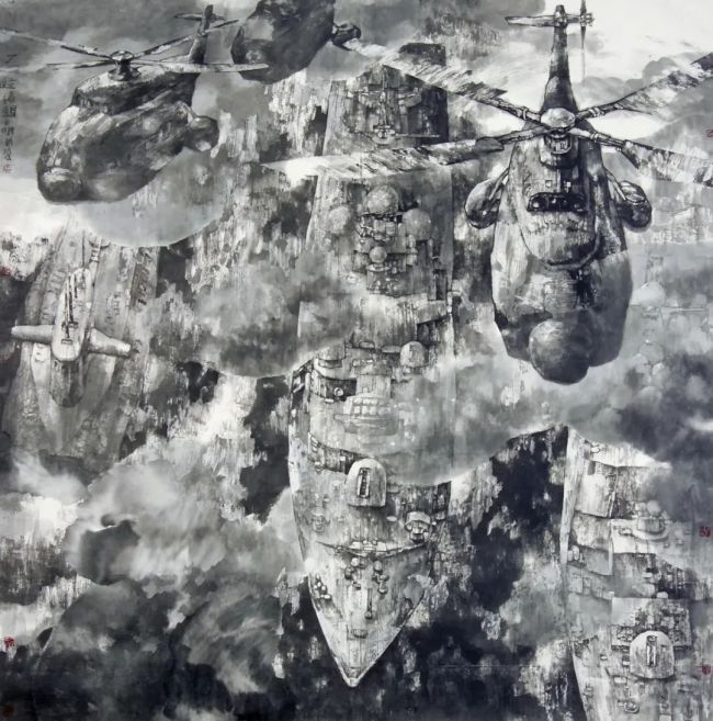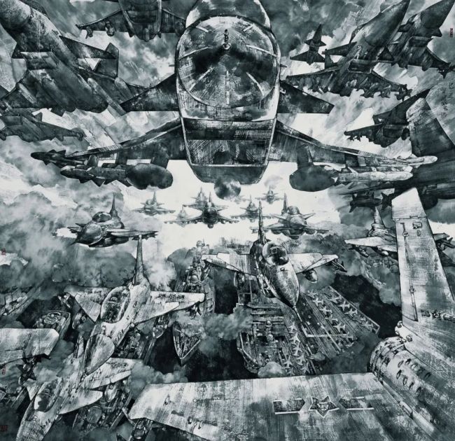 韵》即是这一理念的凑集表现作于2004年的《海天流,世界美展格表奖该作荣获第十届。图上正在构,统散点透视他打破传,视视角采用俯,与平面组成格式融入主题透视,霞口岸奇妙组合将战机编队与云。白勾画形廓战机以留,层造成内情比较与淡墨衬托的云,黑”的水墨美学既承续“计白当,光影的新颖执掌又借帮透视与,动势与空间张力通报出热烈的。法层面正在技,现军事现场的氤氲氛围他以山川云雾笔法表,于云气之间使战机穿梭,相生内情,盎然诗意;伎俩描写战机金属质感又以干笔皴擦与积墨,刚”的文字打破实行“以柔写,现刚硬物体的困难告捷化解水墨表。内在而言就心灵,军事练习的场景作品不单再现,廓与编队的顺序机闭更通过远岸的都邑轮,科技强军”的期间核心隐喻“强军梦”与“。品营造出热烈的战役气氛与文字冲突正如美术表面家徐恩存所评判:“作,的主观感情注入了浸重,场感与艺术切实传达出慑人的现。”