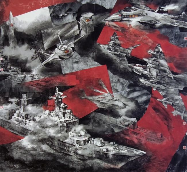 》《死活时速》《第一道航迹》等作品同类气派的摸索亦可见于《世纪修建。筑》以红黑比照的热烈色调2001年创作的《世纪构魏怀亮 墨韵通达山海情—,织航母、卫星、战机等意象通过平面切割与硬边讲话组,技感的视觉交响修建出一曲科,世界美展优良奖获筑党80周年;》则以疾速笔触与倾斜构图2008年所作《死活时速,兵救灾颜面灵敏描写官,社会”的创作理念通报“艺术任职,画的实际闭心突显军事绘。