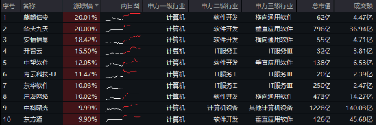 九天20CM涨停麒麟信安、华大,中科曙光10CM封板东华软件、用友搜集、,涨超18%安恒音讯,超15%开普云涨,-U纷纷涨逾11%中望软件、青云科技。