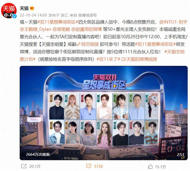一波邀请消费者插手直播定造的高潮本年「天猫618星动夜」曾掀起过,双11而本年,式进一步升级该该互动模。日预售首日起自10月31,的陶醉式全链道直播实质定造玩法用户即可正在淘宝站内体验到全新,预定/阅览直播、货种类草等一站式插手反向定造、抽奖、。机淘宝/天猫App用户只需求掀开手,或特定的明星街区名字探寻【天猫全明星】,天猫双11全明星直播盛典火爆出星专属局部空间即可进入到明,明星与消费者之间的隔断一共互动经过再次拉近了,做采选边种草新品让消费者能边看边,户的直播定造结果而天猫则遵照用,播街区漫游指南天生了四大直。