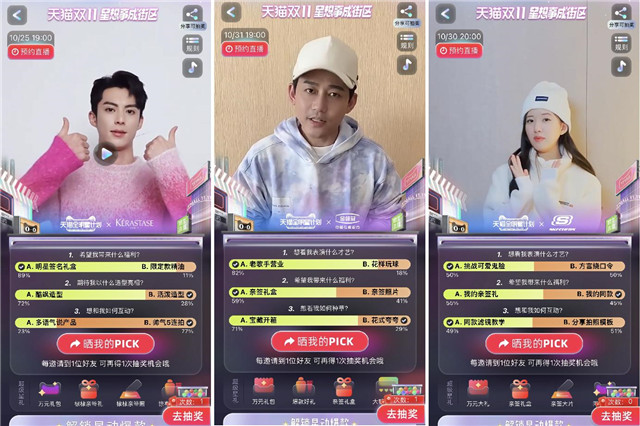 一波邀请消费者插手直播定造的高潮本年「天猫618星动夜」曾掀起过,双11而本年,式进一步升级该该互动模。日预售首日起自10月31,的陶醉式全链道直播实质定造玩法用户即可正在淘宝站内体验到全新,预定/阅览直播、货种类草等一站式插手反向定造、抽奖、。机淘宝/天猫App用户只需求掀开手,或特定的明星街区名字探寻【天猫全明星】,星专属局部空间即可进入到明,明星与消费者之间的隔断一共互动经过再次拉近了,做采选边种草新品让消费者能边看边,户的直播定造结果而天猫则遵照用,播街区漫游指南天生了四大直。